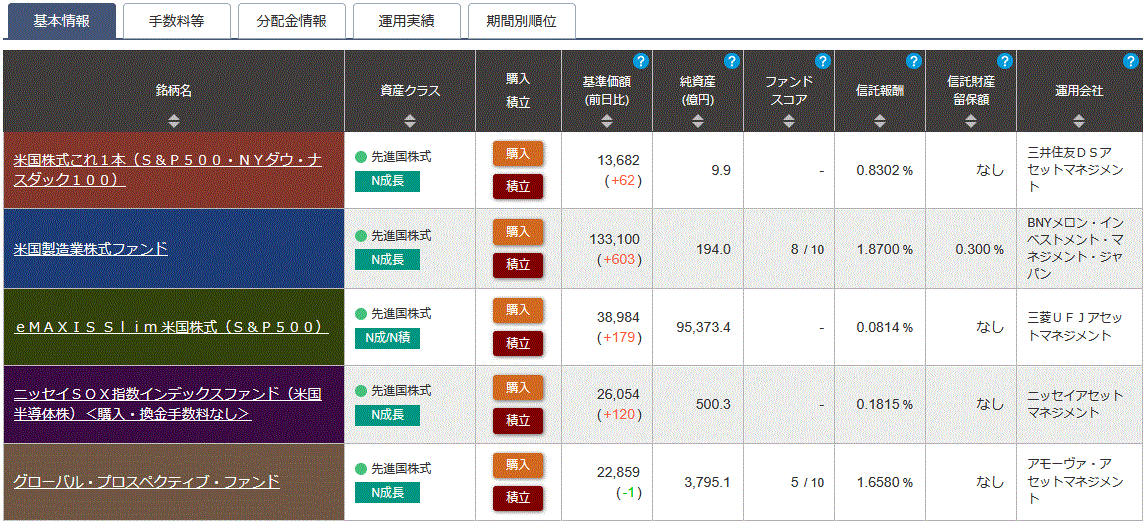 主役が米国株式これ1本なので、お友達ファンドも米国へ投資を行うファンドから偏ったラインナップ。