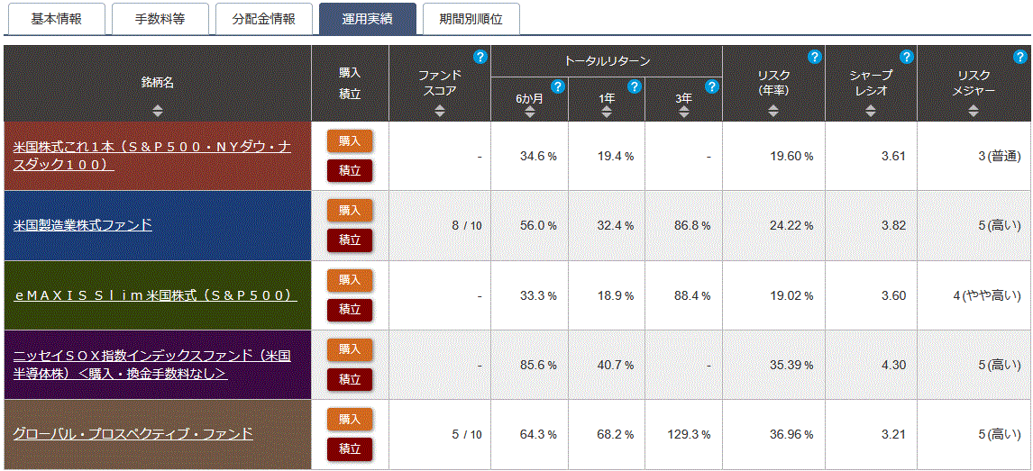 ちなみに基準価格の桁が大きい米国製造業株式ファンドは2015年運用開始の模様。この中では最古参っぽい。このファンドもスゴイんだよ、本当に。