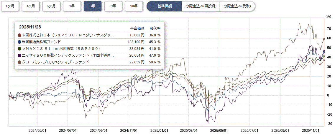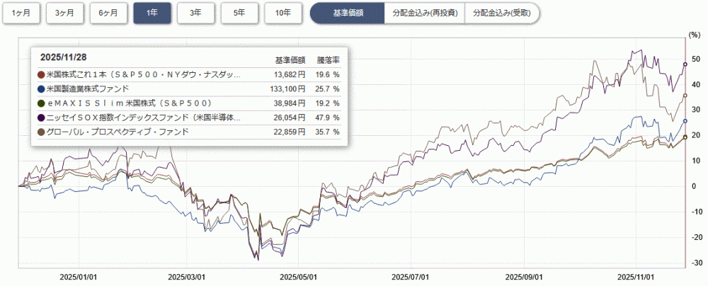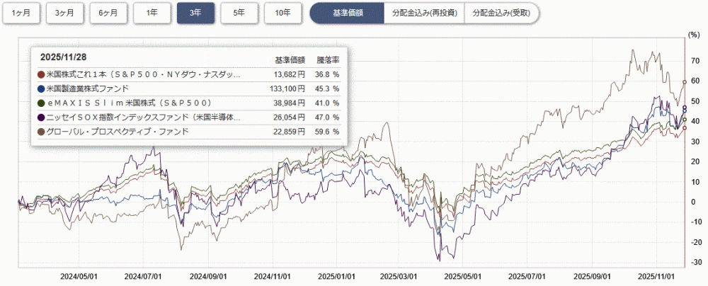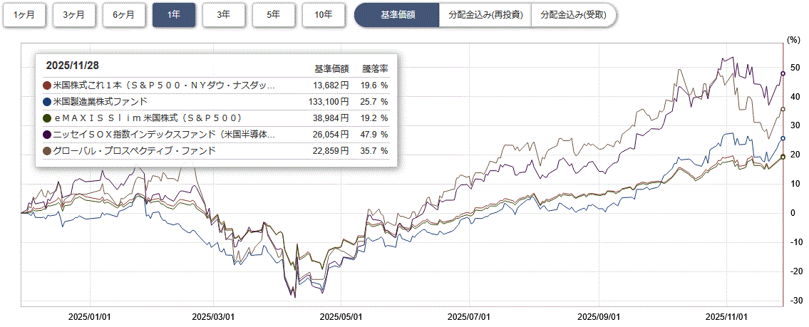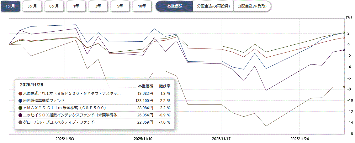 これは1年半くらい?2024年5月から2025年11月のチャート。数字が中途半端なのは運用期間が短いファンドに合わせている都合。これ以上は長い期間比較できないかな?たぶん。(マネックス証券さんだとできたかも。)