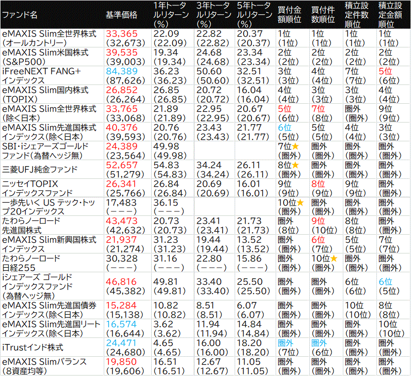 今回からおためしで基準価格にも色分けを導入。ぱっとみ、ランキングの順位以外での挙動がみれたらいいかなって。