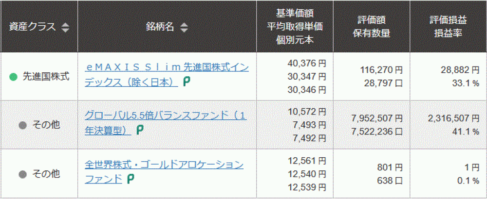 Tracers S&P500ゴールドプラスは運用開始時からのフレンズで。等倍株価指数と先物で株式とゴールドを均等保有するファンド。初手マネックス証券での購入。その後SBI証券に移動する際、一度売却を挟んだことで取得単価が上がってる風味。