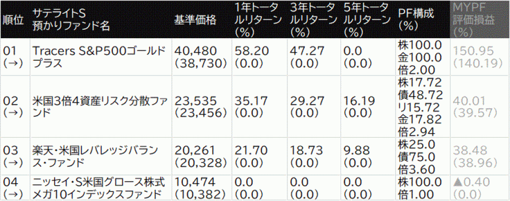 今までの名残りで順位の項目は残留。基準は右端の影の薄い「MYPF評価損益」によるもの。ちなみに影の薄い色にしているのは、その他の項目がファンドの数字を表すのに対し「MYPF評価損益」はトワナナさんの保有する数字になるため区別の意図。