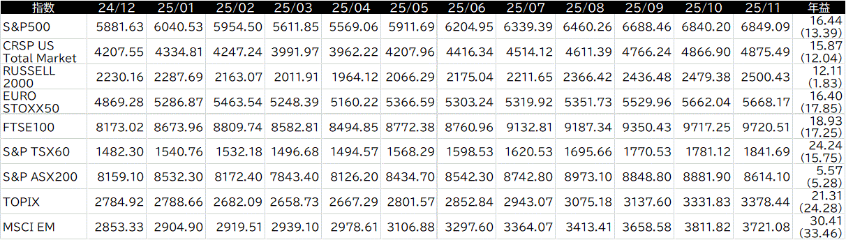 この表はTracers グローバル2倍株が採用している指数の数値を独自にまとめたもの。