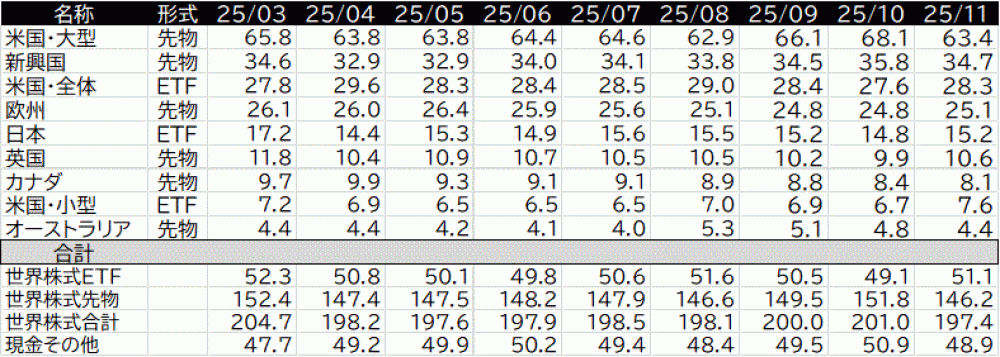 そのため実質的に為替の影響を受けるのは、主に新興国の先物取引部分になるよう運用される。今回の数値でグラフにするとこのような感じ。