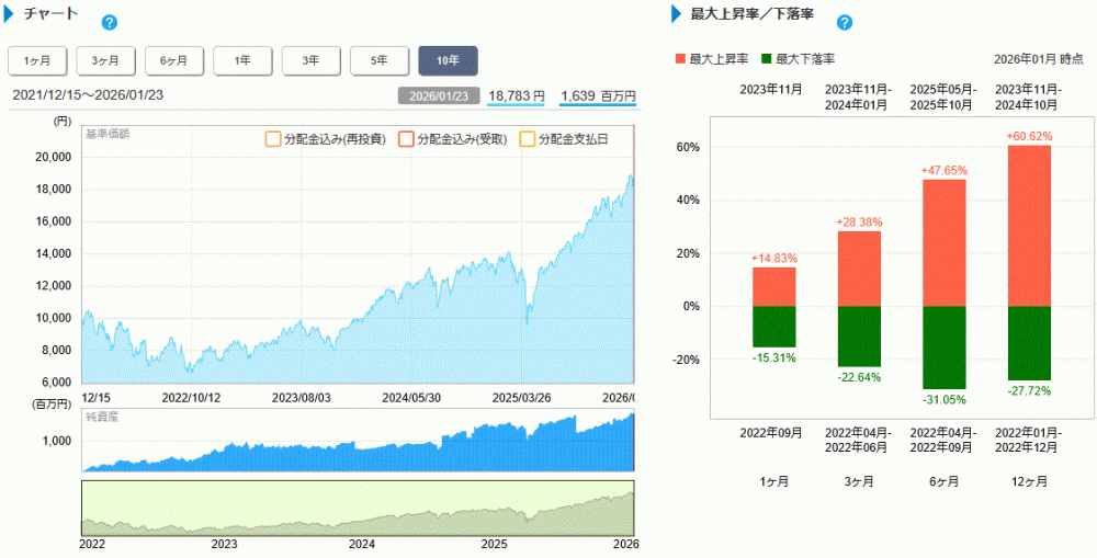 時価総額加重をベースとするインデックスとは異なる挙動になっている。以下の2枚の画像は、松井証券ホームページから撮影したスクリーンショットによる2026年1月25日時点のファンドの情報。