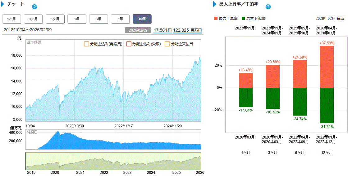 ドルコスト平均法などで高い効果が見込める側面も持つ。以下の2枚の画像は、松井証券ホームページから撮影したスクリーンショットによる2026年2月10日時点のファンドの情報。