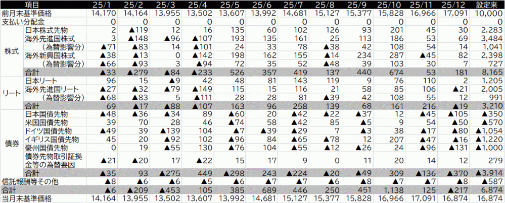 債券は全て先物になり、世界の国債先物取引に係る権利などで運用される。今回の数値でグラフにするとこのような感じ。