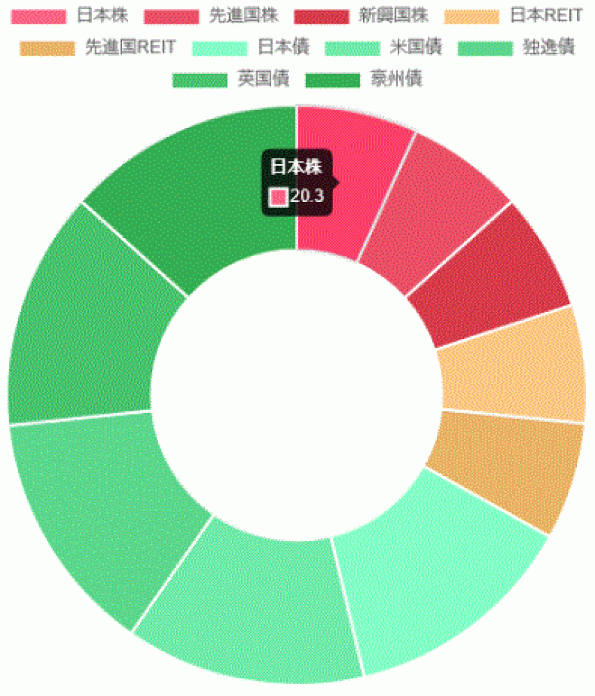 純資産100%比では株式20%・REIT13.3%・債券66.7%をベースにポートフォリオが組まれる。