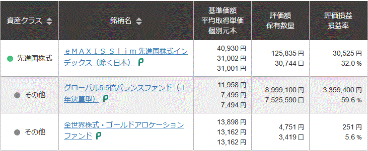eMAXIS Slim先進国株式インデックス(除く日本)は、前回の+32.1%から今回+32.0%。グローバル5.5倍バランスファンドは、前回+45.2%から今回+59.6%に。