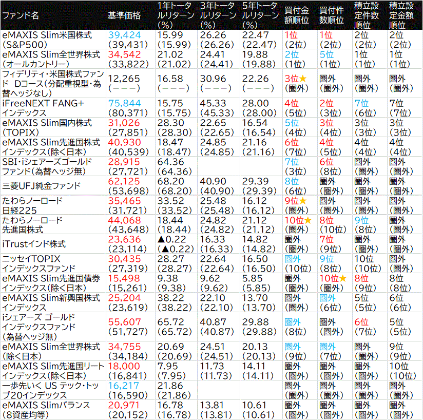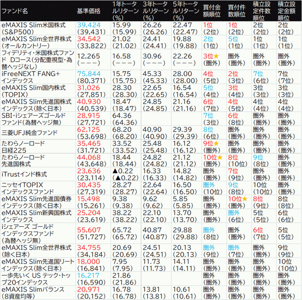 目に付くのは買付ランキングでeMAXIS Slim米国株式(S&P500)が首位を奪取しているところ。